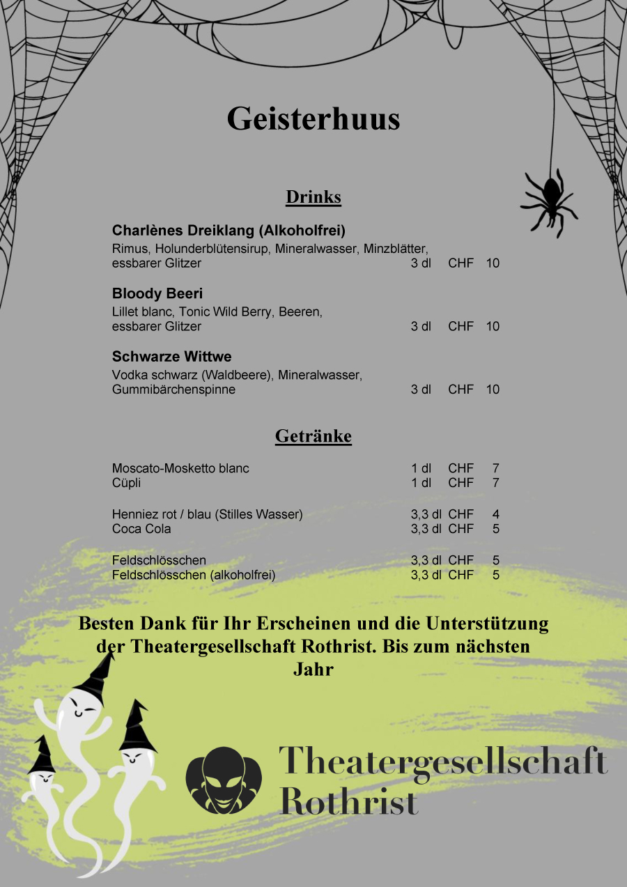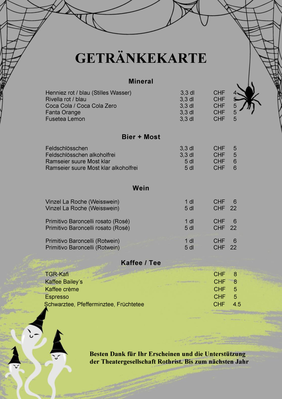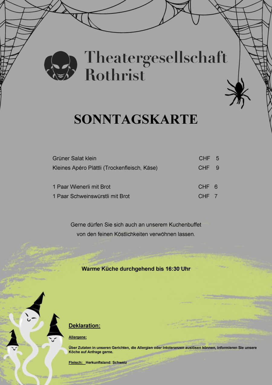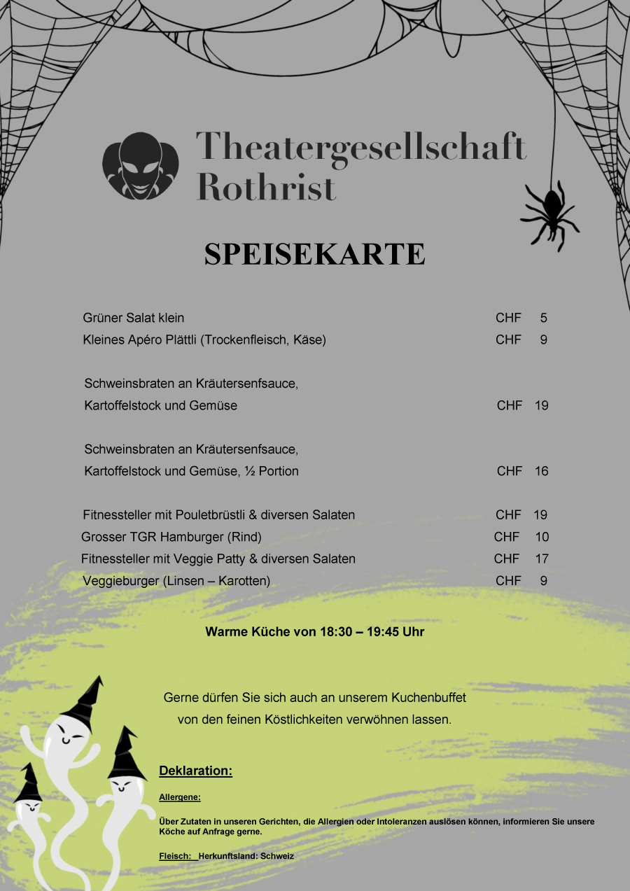 | Von 18:30 bis 19:45 verwöhnen wir Sie mit den traditionellen Theatermenüs aus der eigenen TGR-Küche.  Oder geniessen Sie von unserem Kafiegge Kuchen oder die feinen belegten Brötli.
